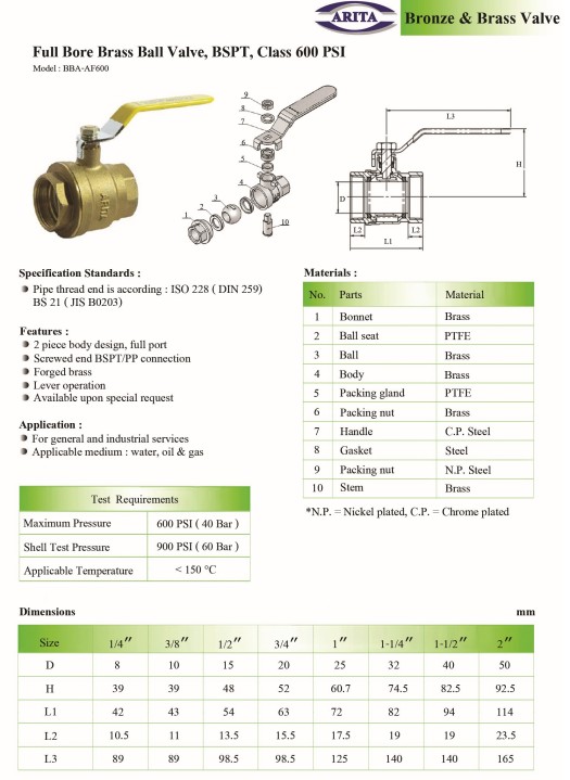 ราคา Ball valve ทองเหลือง BBA-AF600 รูเต็ม